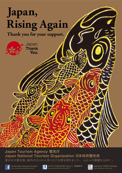 流れの急な龍門という河を登りきった鯉は龍になるという伝説になぞらえて、辰年を迎えた2012年、復興に向け登りきろうという心、そして海外の皆様のご支援への感謝を表したポスターです。